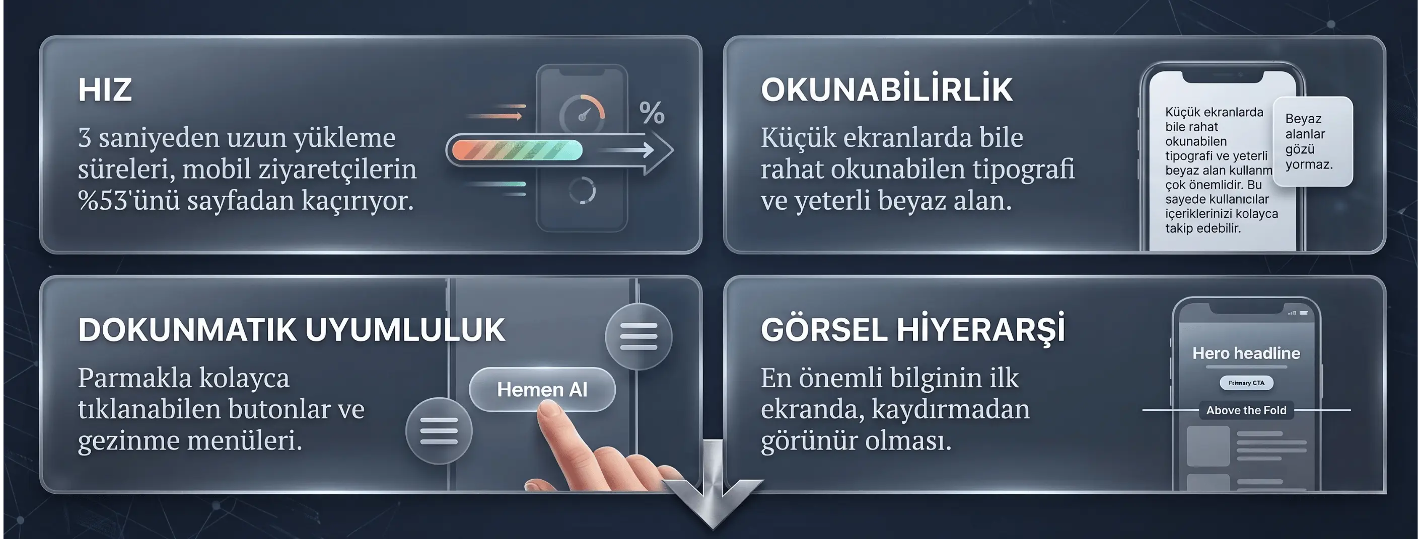 Mobil uyumlu web sitesi tasarımında kritik olan dört unsur vardır: